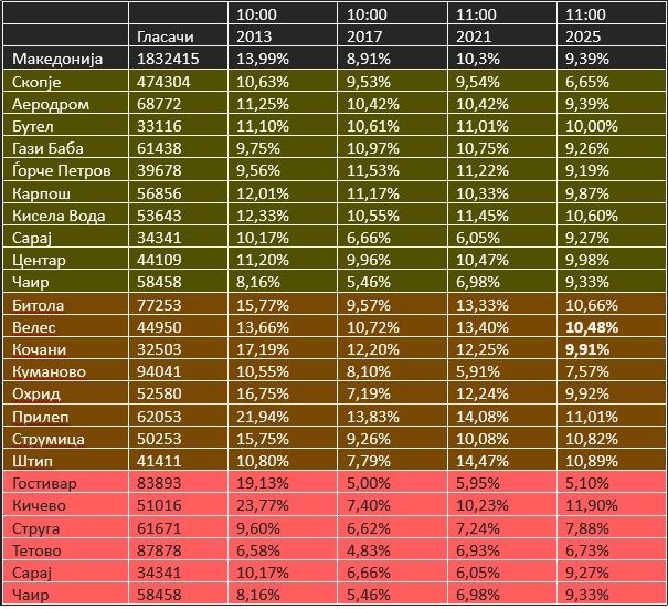 Највисока излезност во скопските општини има во Кисела Вода со 10,60%, потоа Бутел со 10,00% и Центар со 9,98%.