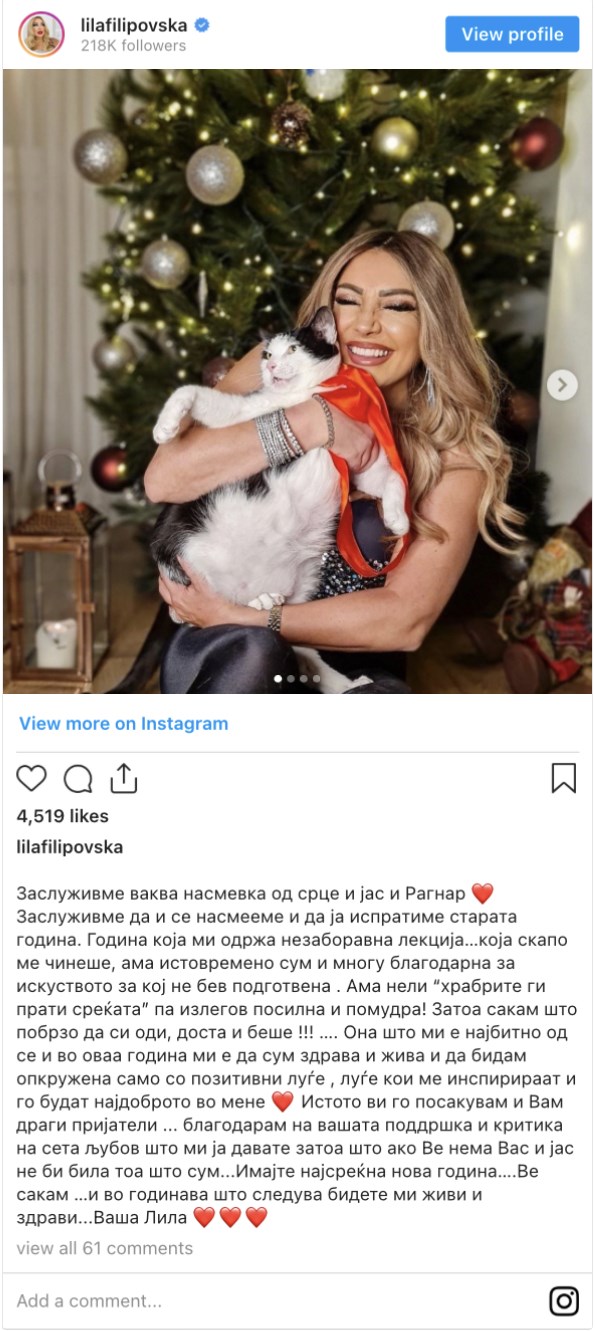 „Истото ви го посакувам и Вам драги пријатели ... благодарам на вашата поддршка и критика на сета љубов што ми ја давате затоа што ако Ве нема Вас и јас не би била тоа што сум...Имајте најсреќна нова година….Ве сакам …и во годинава што следува бидете ми живи и здрави...Ваша Лила“, се дополнува во објавата.
